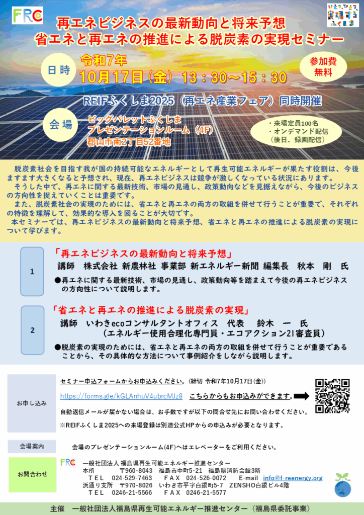 令和7年10月17日(金)『再エネビジネスの最新動向と将来予想 省エネと再エネの推進による脱炭素の実現セミナー』を開催しますのでお知らせいたします。(REIFふくしま2025(再エネ産業フェア)と同時開催)