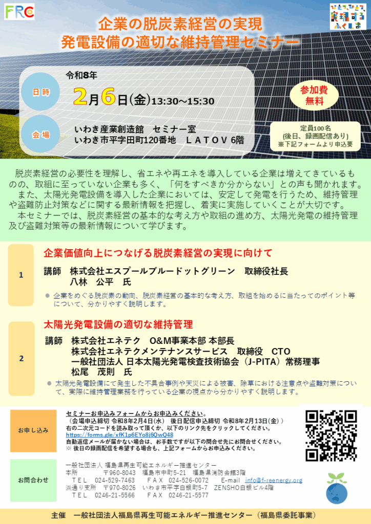 令和8年2月6日(金)に『企業の脱炭素経営の実現 発電設備の適切な維持管理セミナー』を開催しますので